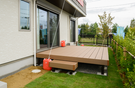 玄関までのアプローチ、リビングからつながるウッドデッキ、人工芝の庭、植栽、車3台分の駐車場、物置の設置など