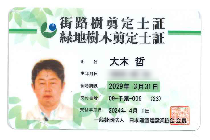 - 1級造園施工管理技士 / 1級土木施工管理技士 / 街路樹剪定士 / 緑地樹木剪定士 / 建築コンクリートブロック工事士 / 登録エクステリア基幹技能者 / 1級ガーデンセラピーコーディネーター / ブロック塀診断士 / 監理技術者 / 農薬管理指導士 / 1級エクステリアプランナー